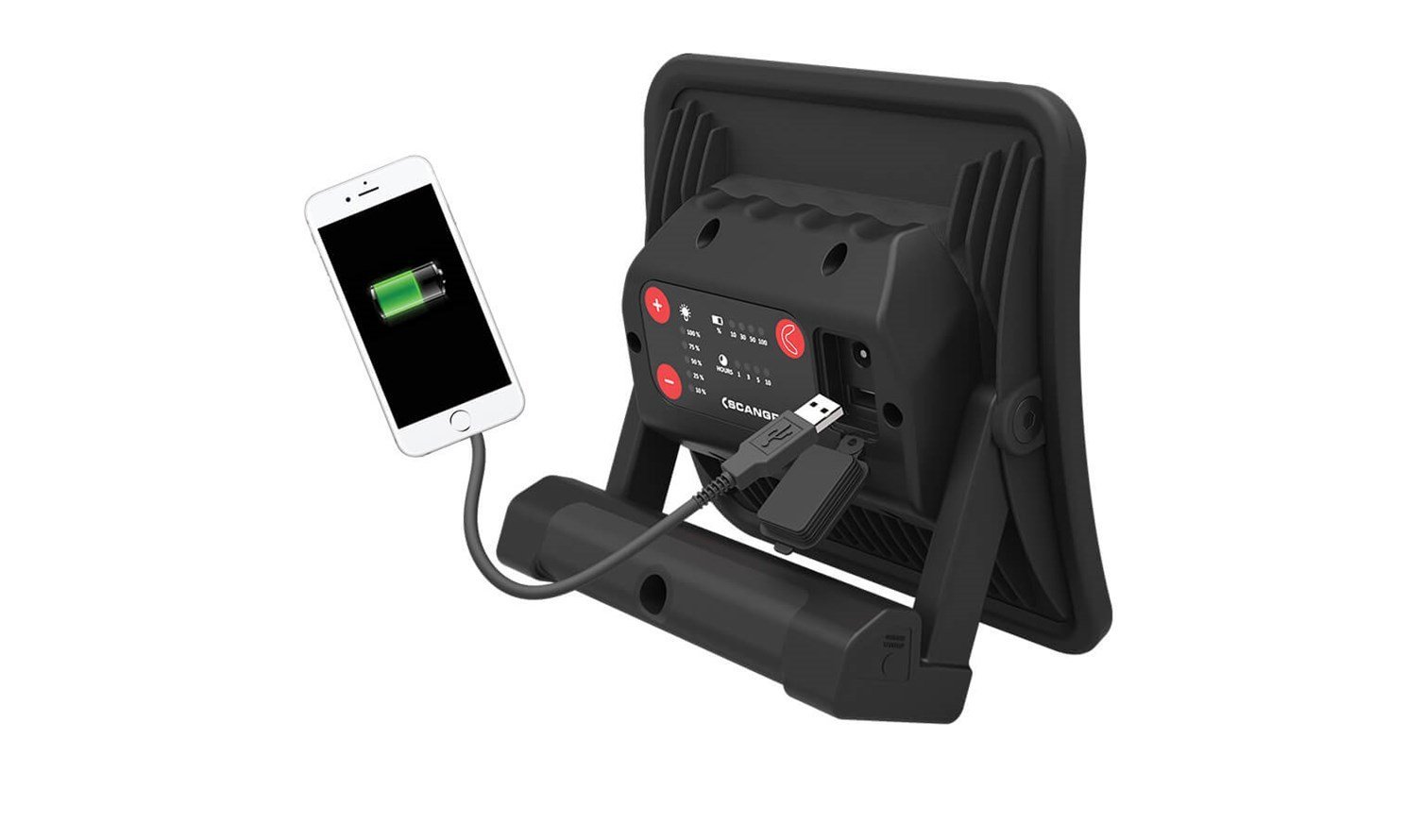 The lamp is easy to carry and is ergonomically designed for a good grip on the handle, which is also equipped with powerful integrated magnets for flexible mounting. Due to the flexible handle the NOVA R can be placed in different positions to obtain the desired lighting angle. The handle is designed for direct mounting on the TRIPOD or the SCAFFOLDING BRACKET. As an extra feature, NOVA R has a built-in power bank with USB outlet to charge mobile devices.